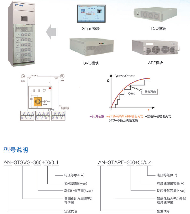AN-STSVG is the best alternative to traditional dynamic reactive power compensation equipment, if focus to consider filtering effect, AN-STAPF is the best alternative to traditional dynamic filter compensation device, on the one hand, traditional dynamic reactive power compensation device has been put into cut frequently and service life is greatly「educed, on the other hand, traditional reactive power compensation response speed is slow and overall compensation effect is not ideal, it can bring fine of power sector; and AN-STSVG can be integrated with its intelligent active + passive way; not only compensation effect is obvious, but the service life of equipment is longer than that of ordinary one.