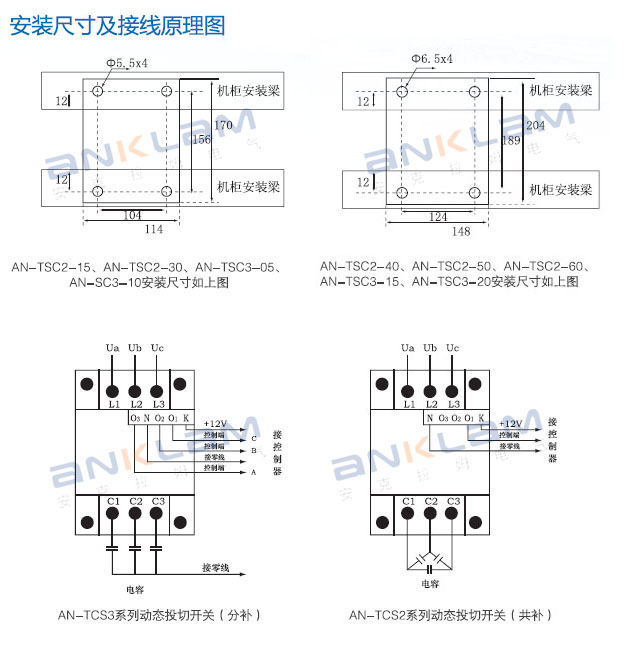 本系列采用大功率反并联晶闸管模块、隔壁电路、触发电路、保护电路及散热装置等元件组成,可用于690V以下容性或感性负载的通断控制,通断时无涌流,无过电压,工作时无噪音,允许频繁投切,安装,接线简单方便,特别适用于快速投切的SVC型动态低压无功补偿装置。其中AN-TSC3系列动态投切开关的三相独立控制技术解决了三相不平衡冲击负荷补偿的技术难题,为补偿装置中最优选择。该系列动态投切开关通过了电力工业无功补偿成套质量检验测试中心的检验。